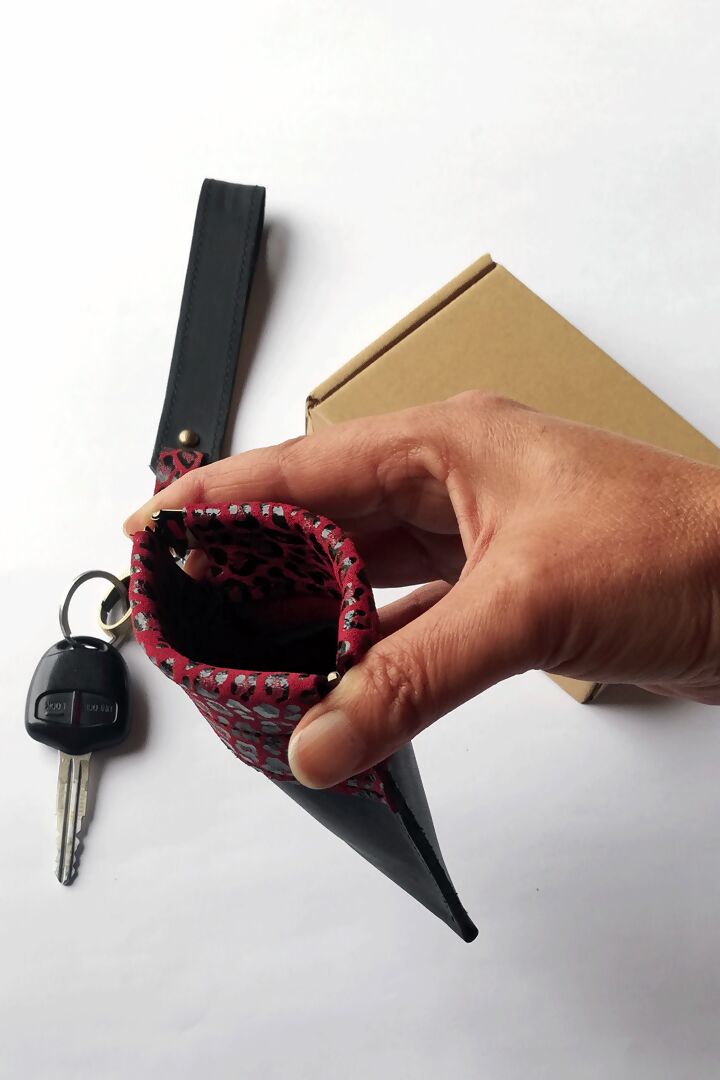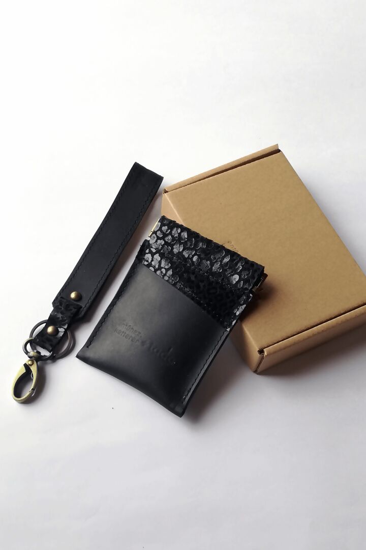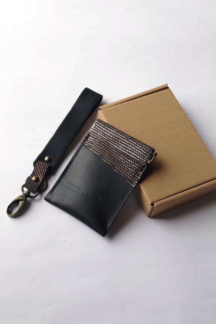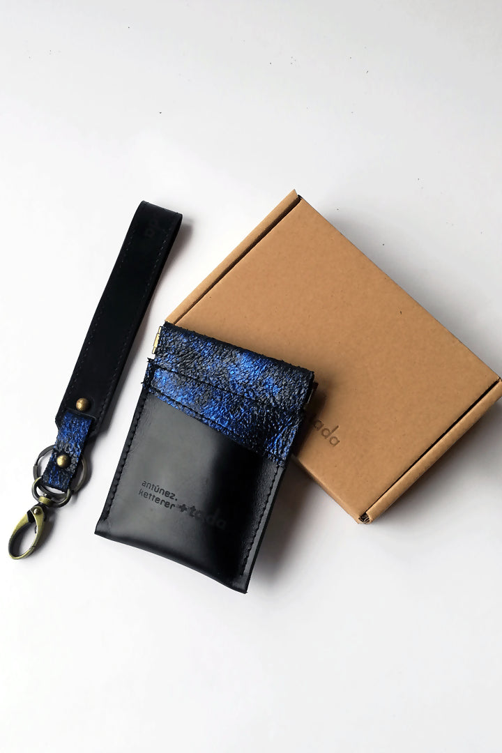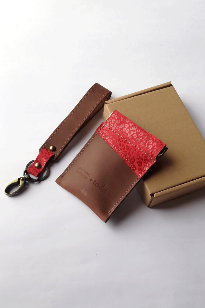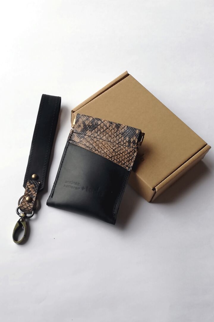 Confeccionado con cuero proveniente de retazos de zapatería, este tarjetero/monedero fue diseñado  para llevar tus documentos y dinero de manera cómoda y segura. Tiene dos compartimentos para tarjetas y documentos y un sistema de cierre con fleje metálico que evita que se caigan las monedas o lo que quieras transportar.